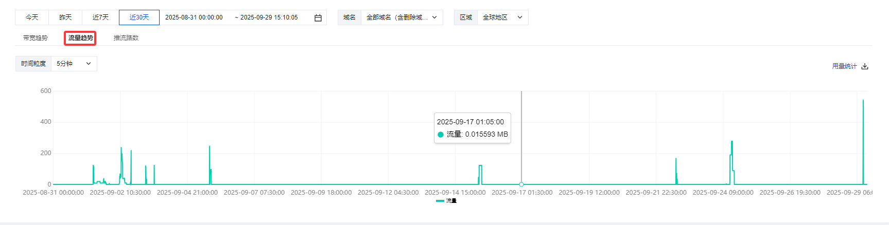 流量趋势 | 统计所有播放域名在查询的时间段内使用加速服务消耗的总下行流量。 |