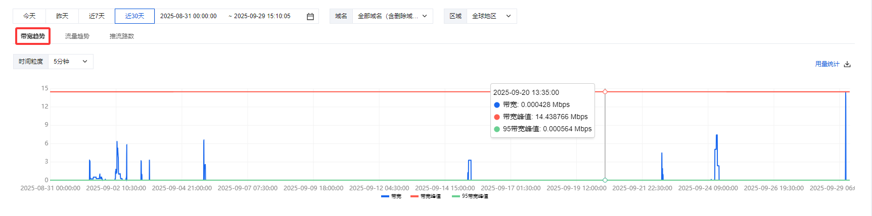 带宽趋势 | 统计所有播放域名在查询的时间段内使用加速服务消耗的总下行带宽峰值。 |