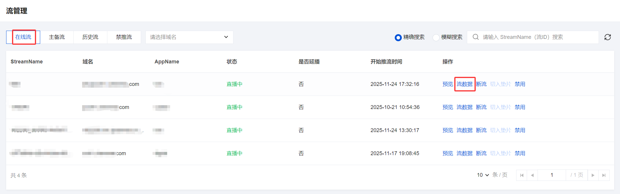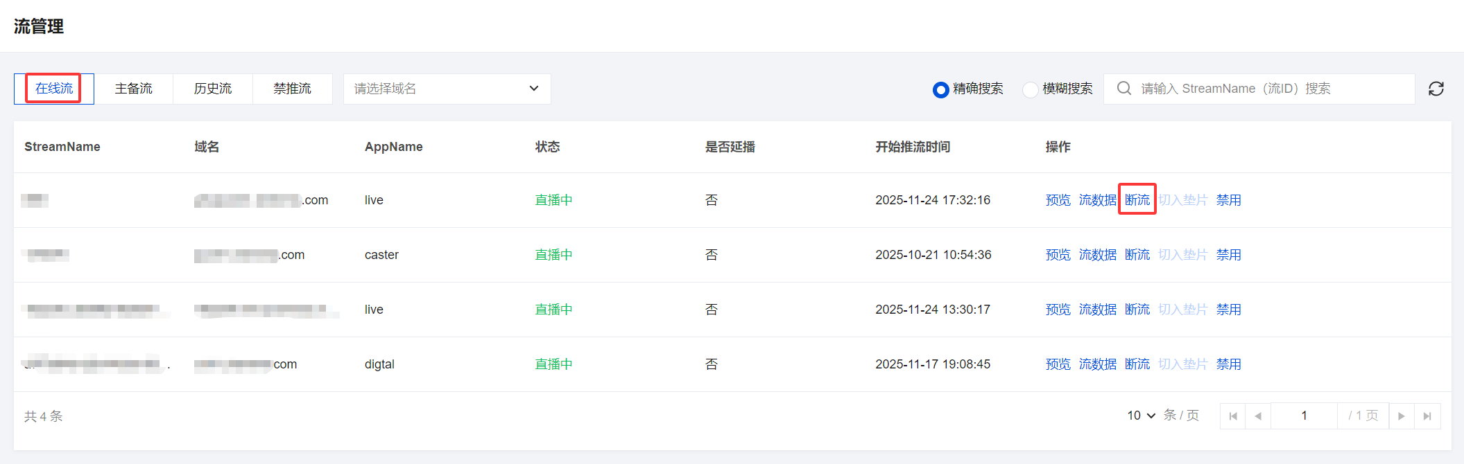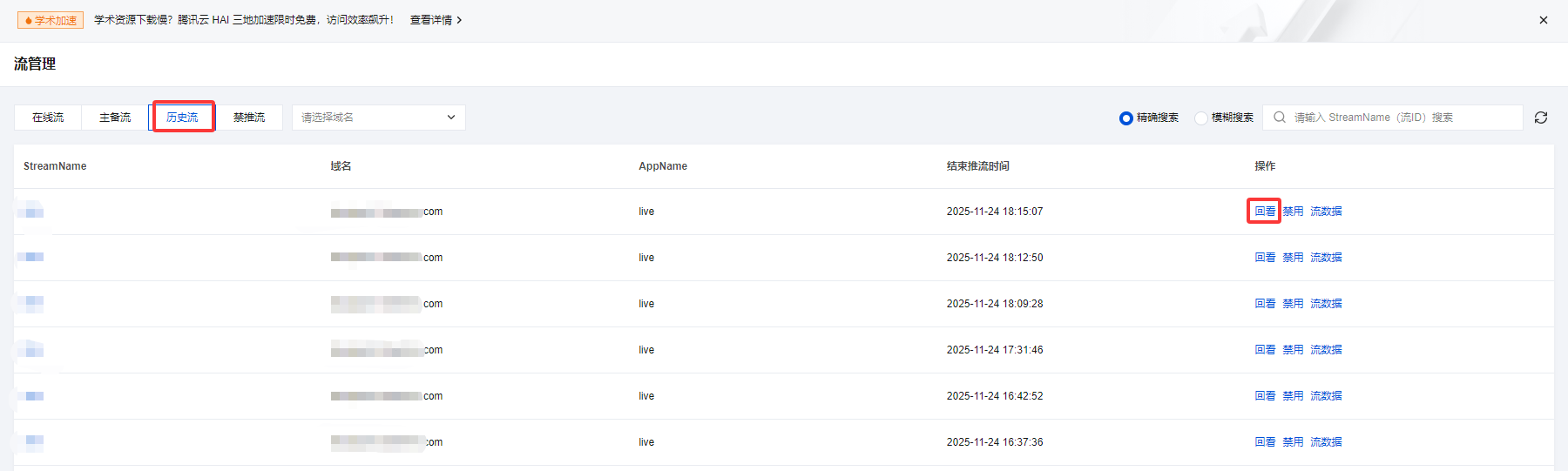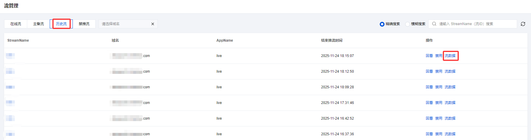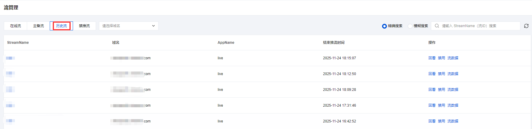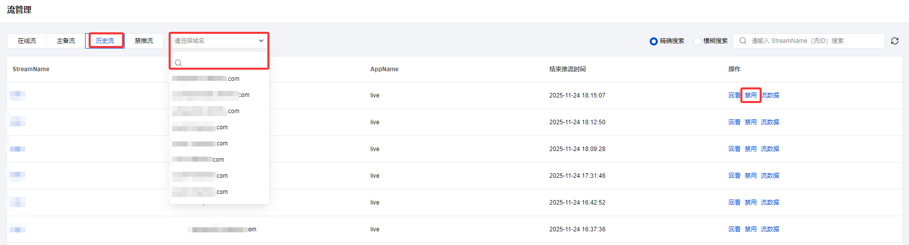 在历史流列表中,可选择待查询的域名与对应的历史直播流。单击禁用即可对该历史直播流进行禁用。