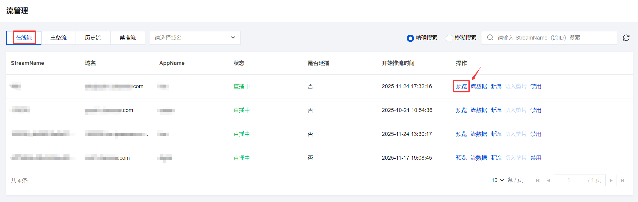 在线流列表中,可选择待查询的域名与对应的在线流。单击右侧的预览可查看实时直播画面、高光切片和智能摘要信息。