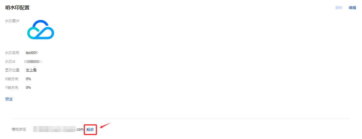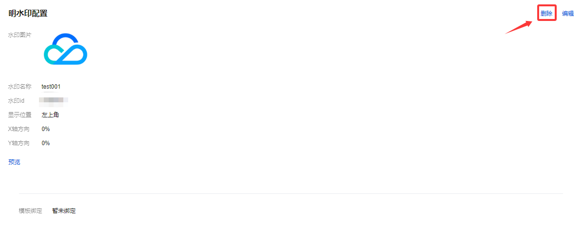 2. 选择您已创建成功的明水印模板,单击右上方的删除。