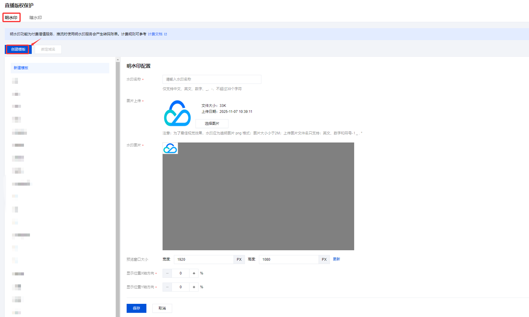 通过云直播控制台创建水印模板,具体操作请参见 创建明水印模板。
