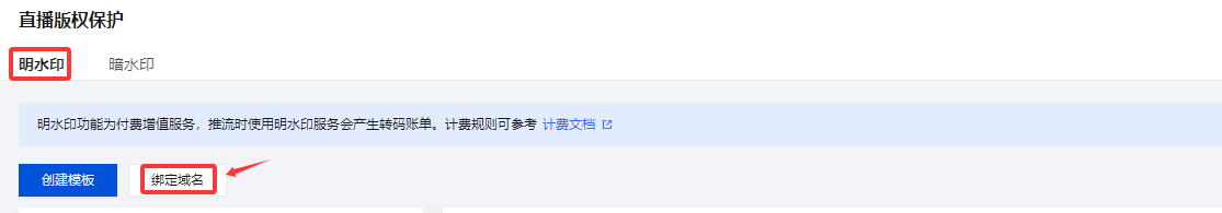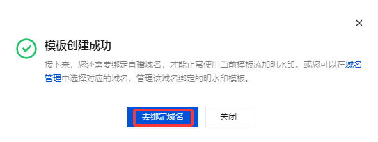 新明水印模板创建成功后关联域名:明水印模板创建 成功后,单击提醒框中的去绑定域名。