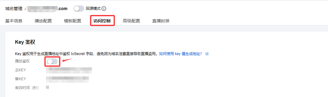 当您关闭 Key 鉴权后,您的直播服务可能面临被他人盗播的风险,从而产生额外的服务费用。为了保护您的直播内容安全,建议您保持 Key 鉴权配置状态开启。