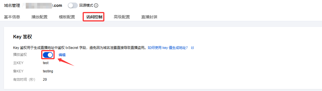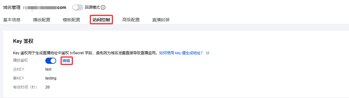 2. 在访问控制 > Key 鉴权,单击编辑进入 Key 鉴权配置页。