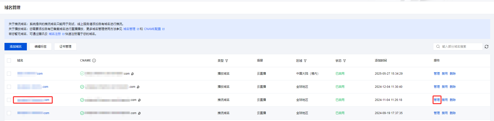 1. 进入 域名管理,单击需配置的推流域名或管理进入域名详情页。