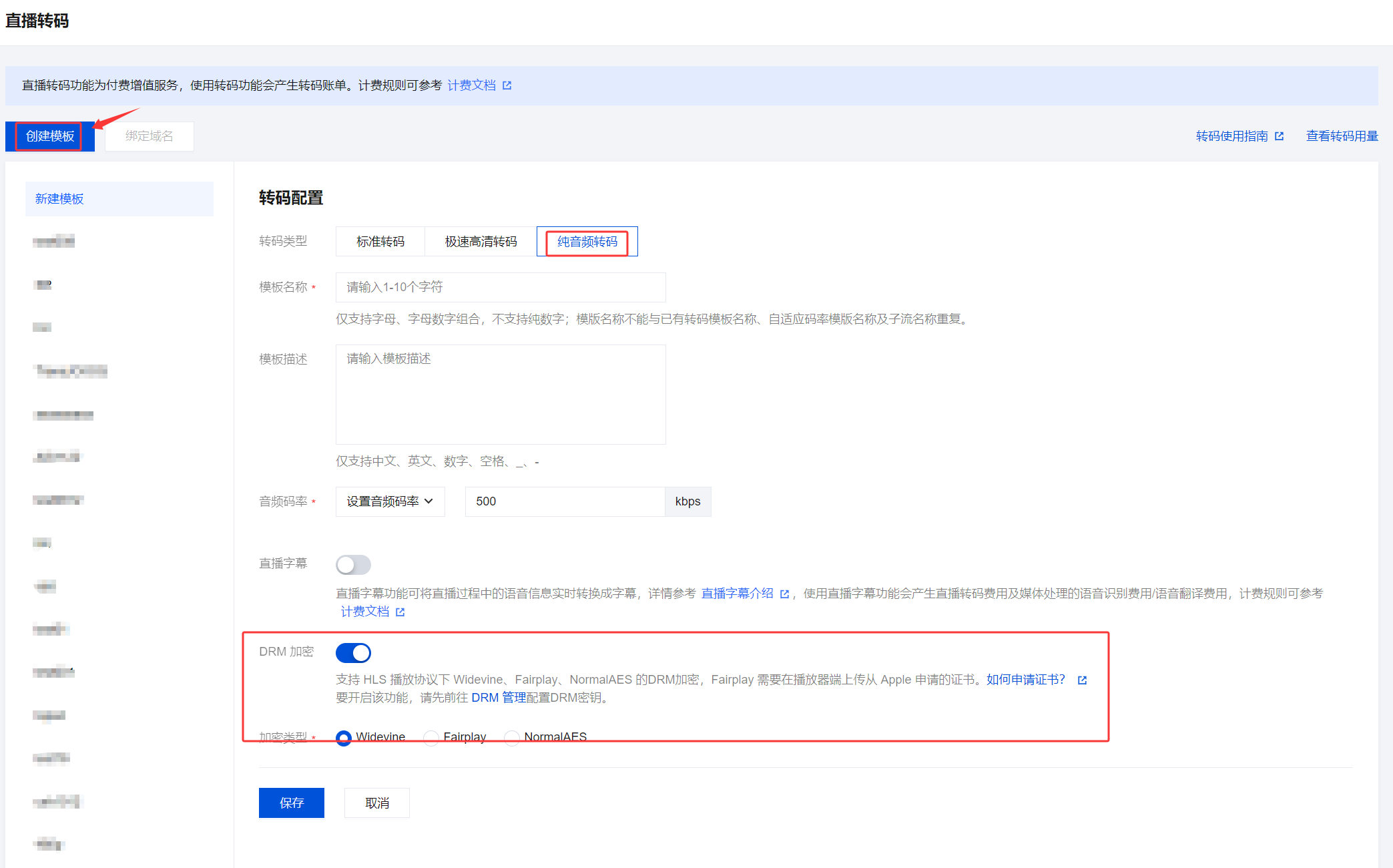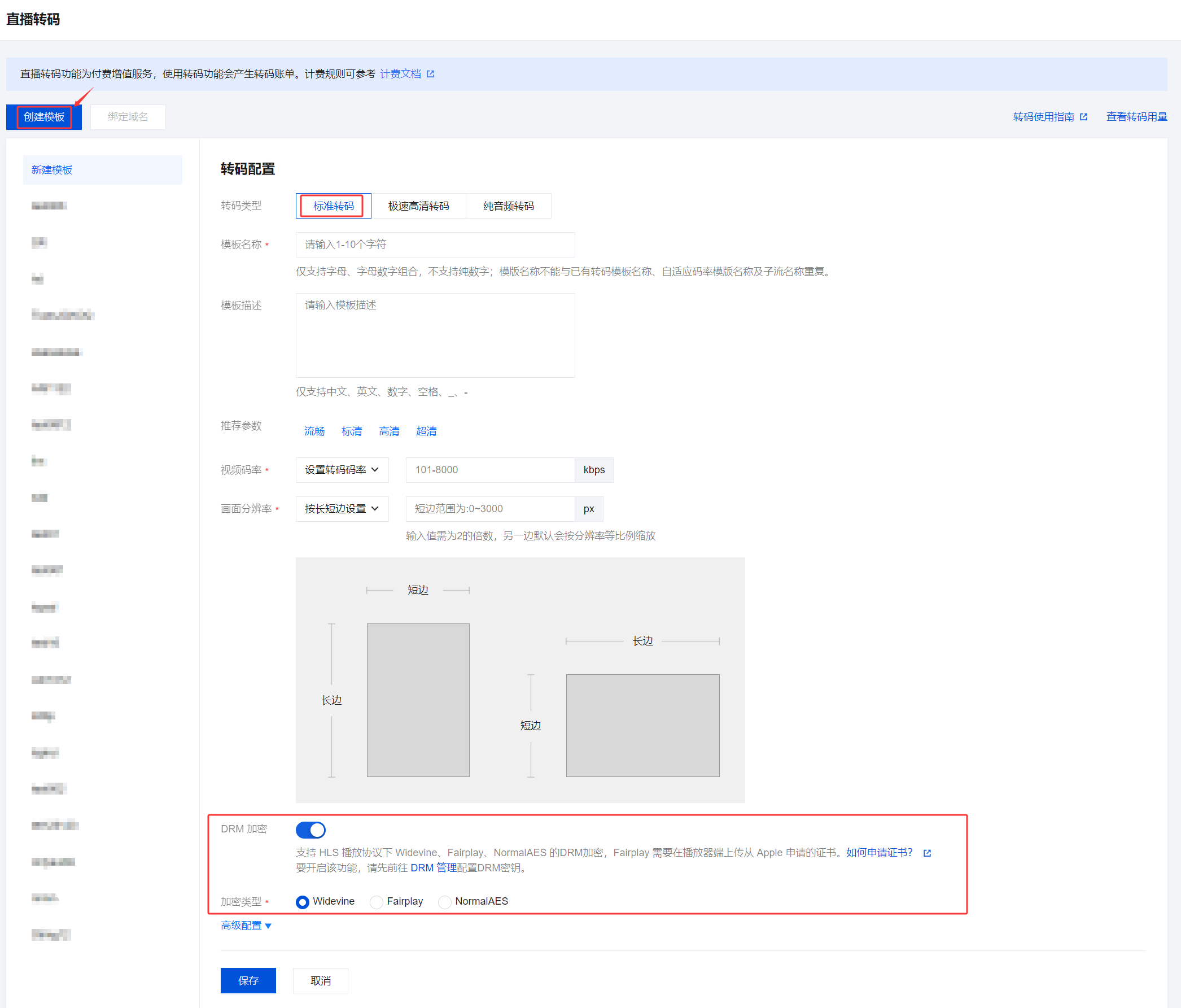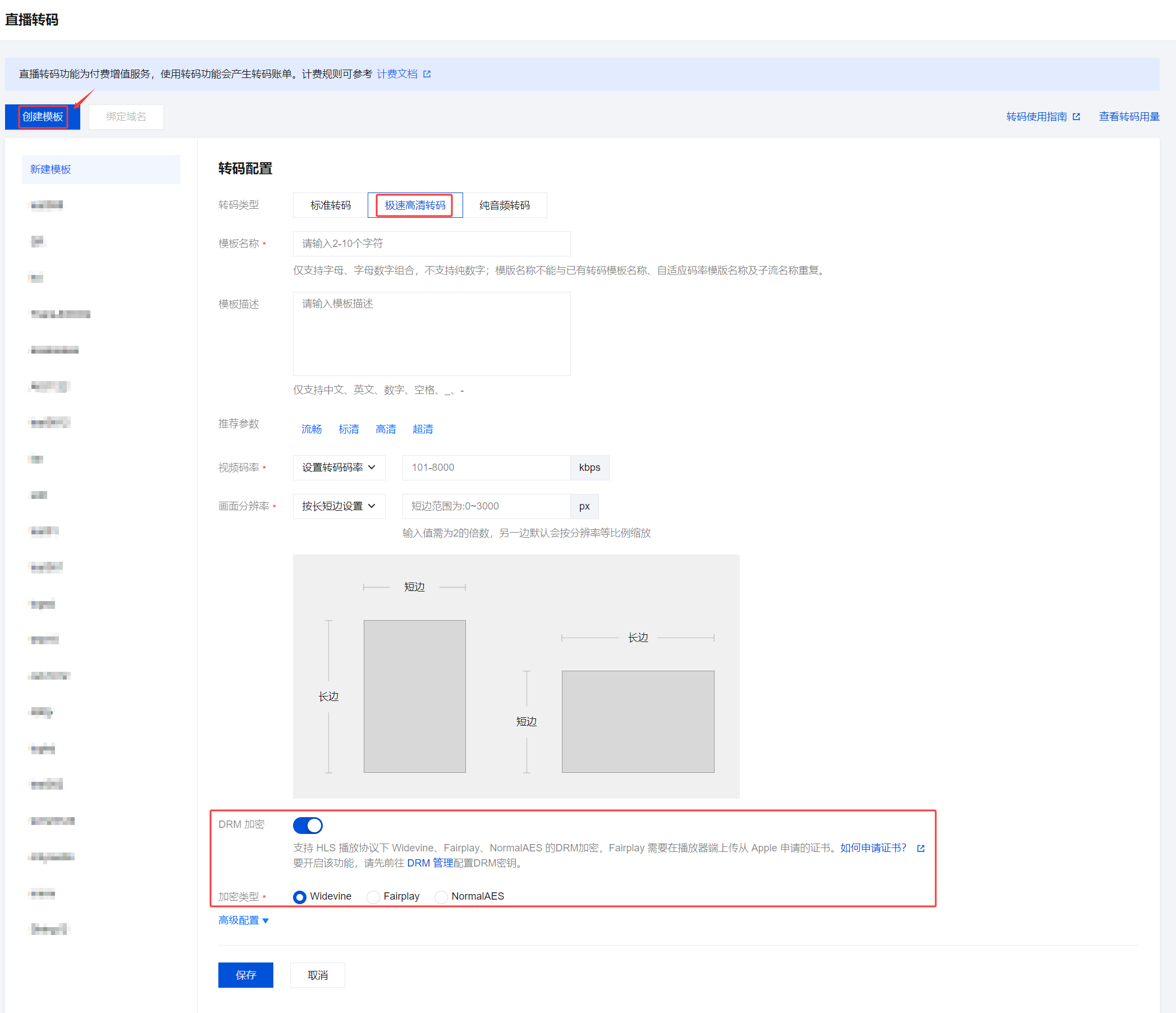 2. 单击创建模板进入转码配置页面,单击