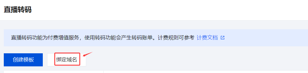 新转码模板创建成功后关联域名:设置转码模板 成功后,单击提醒框中的去绑定域名。