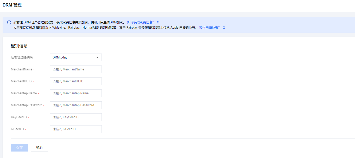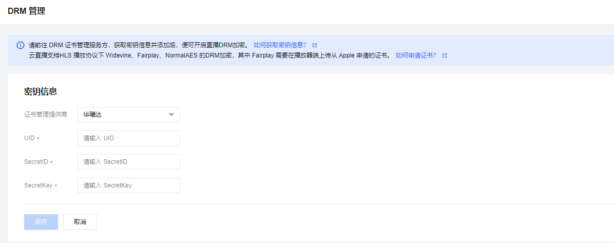 3. 填写密钥信息,选择证书管理提供商,可选择华曦达或 DRMtoday,具体配置如下: