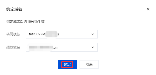 3. 在域名绑定窗口中,选择您需绑定的转码模板及播放域名(可同时绑定多个播放域名),单击确定即可绑定成功。