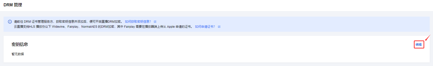 2. 单击右侧的编辑,进入 DRM 管理配置页。