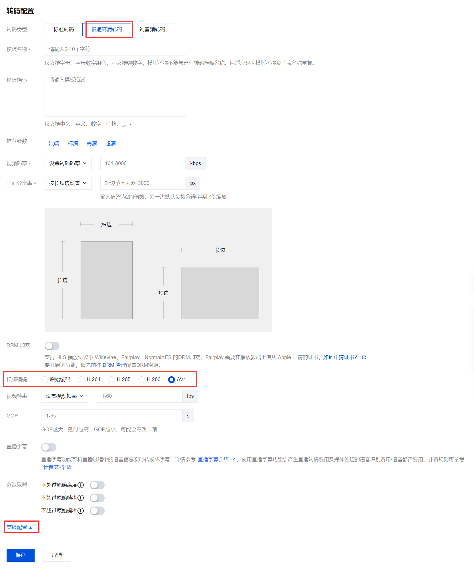 3. 选择转码类型为标准转码或极速高清转码,展开高级配置。在编码方式中选择 AV1。