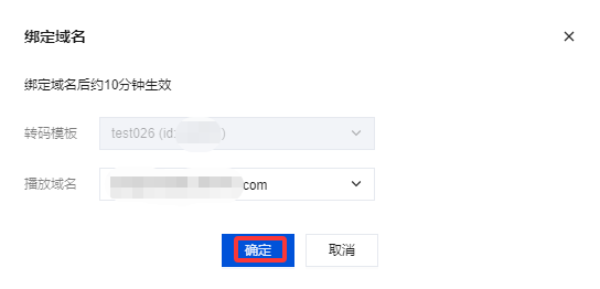 3. 在域名绑定窗口中,选择您需绑定的自适应码率模板及播放域名(可同时绑定多个播放域名),单击确定即可绑定成功。