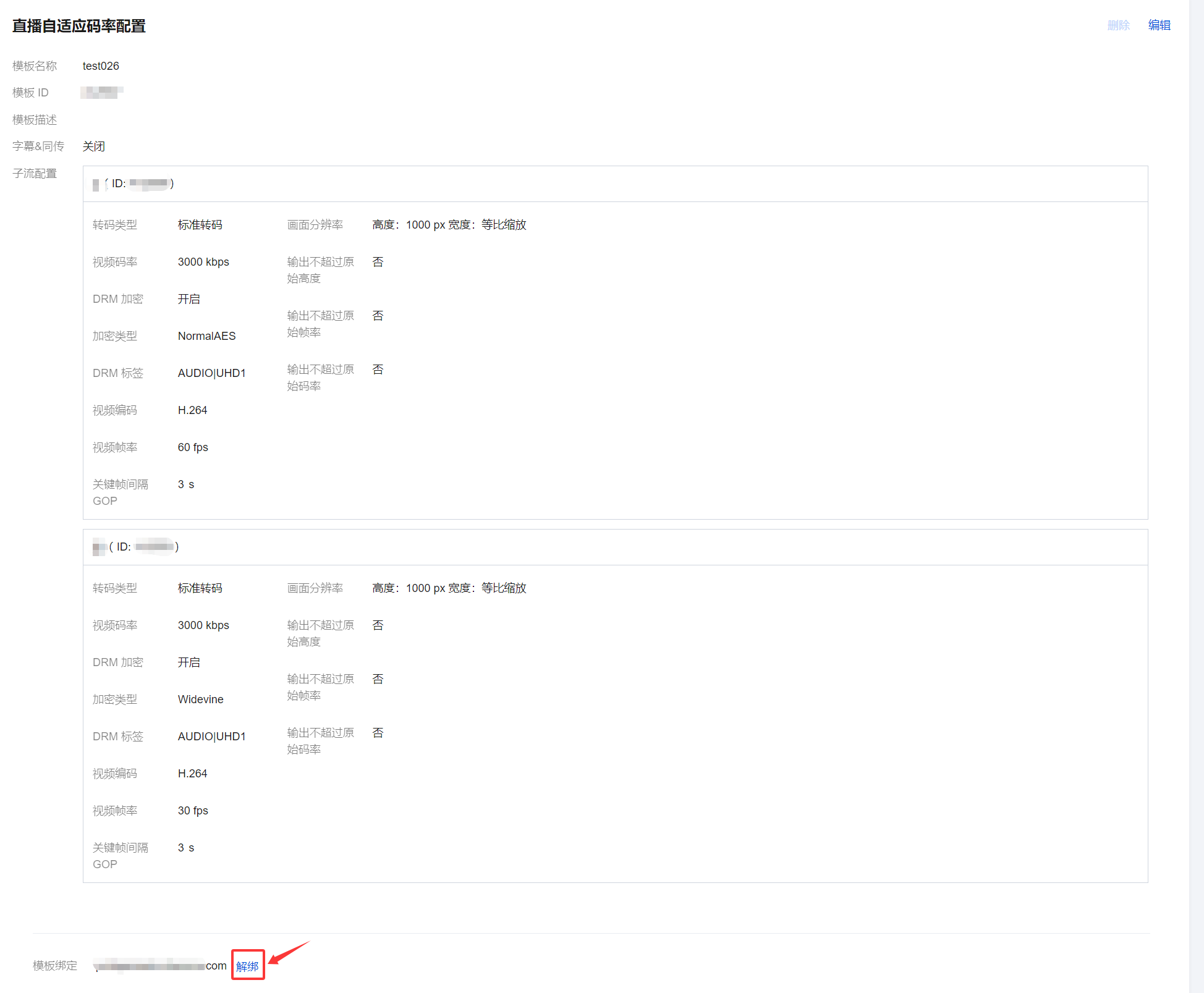 2. 选择已关联域名的转码模板,单击解绑。