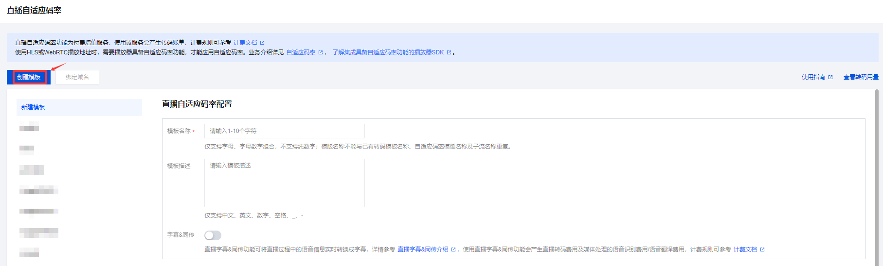 模板描述 | 否 | 直播自适应码率模板描述,仅支持中文、英文、数字、空格、_、-。 |