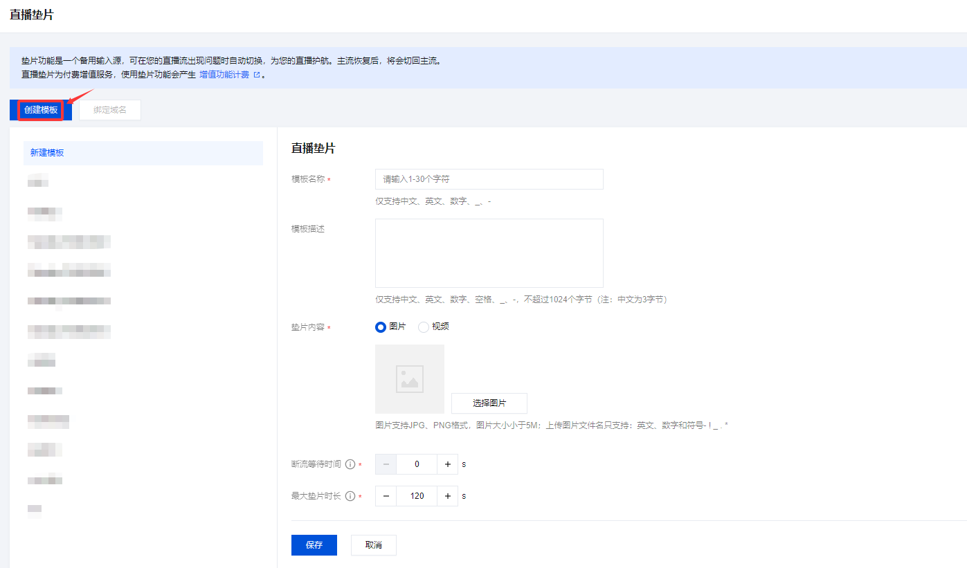 云直播提供直播垫片功能,在直播流断流时自动切换为垫片输入源,在主流恢复后,也会自动切回主流,从而提升意外断流时的观众直播体验。本文将向您介绍如何通过控制台创建、绑定、解绑、修改及删除垫片模板。