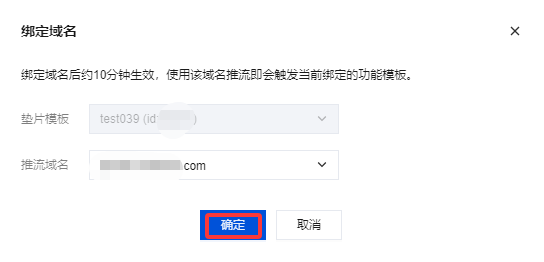 3. 在域名绑定窗口中,选择您需绑定的垫片模板及推流域名(可同时绑定多个推流域名),单击确定即可绑定成功。