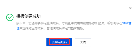 新垫片模板创建成功后关联域名:垫片模板创建成功后,单击提醒框中的去绑定域名。