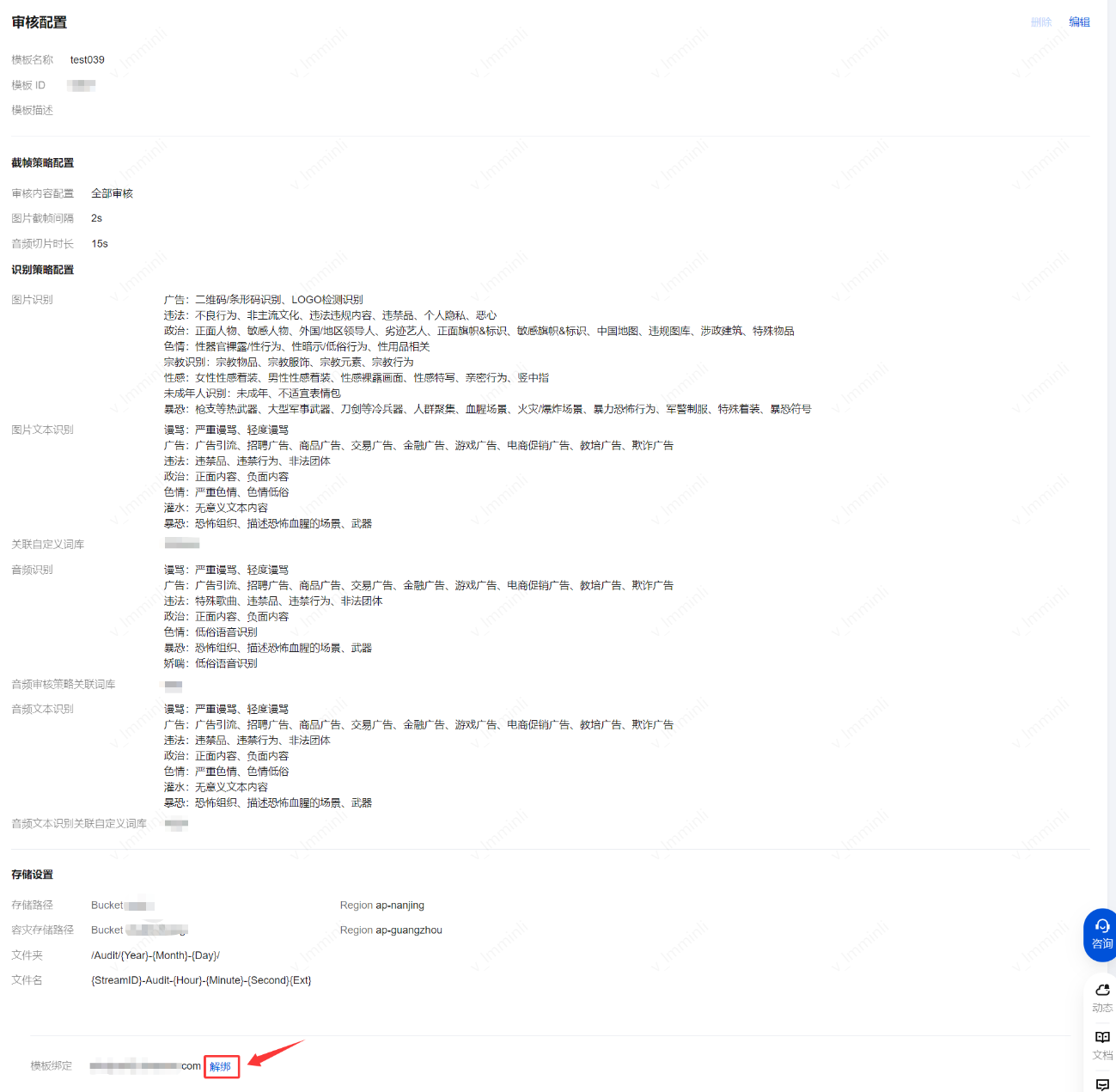 2. 选择已关联域名的直播审核模板,单击解绑。