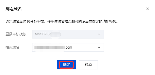 3. 在域名绑定窗口中,选择您需绑定的直播审核模板及推流域名(可同时绑定多个推流域名)单击确定即可绑定成功。