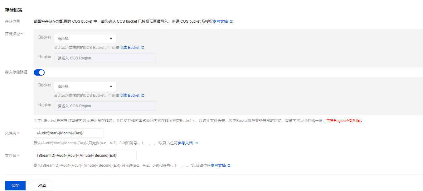容灾存储路径 | 否 | 可开启容灾存储路径,当主用 Bucket 异常导致审核内容无法正常存储时,会自动存储将审核返回内容存储至容灾 Bucket 下,以防止文件丢失,容灾 Bucket 仅在业务异常时启用,审核内容只会存储一份,主备 Region 不能相同。 |