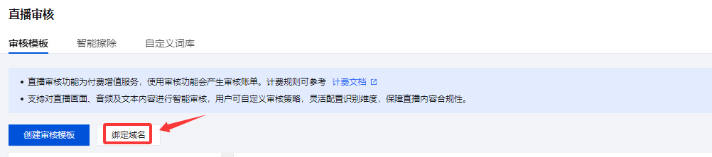 新审核模板创建成功后关联域名:审核模板创建成功后,单击提醒框中的去绑定域名。