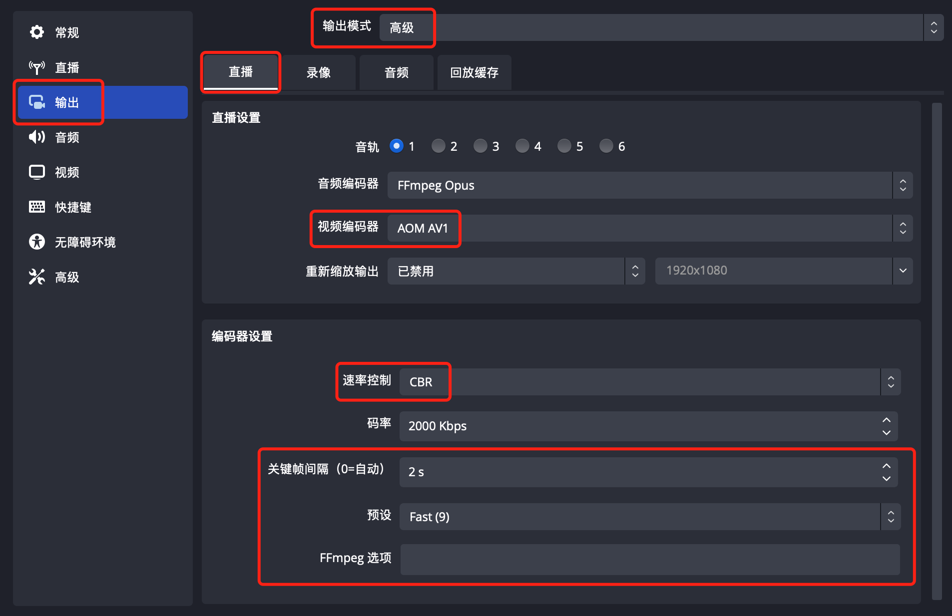 1. 通过控件 > 设置 > 输出。进入推流参数设置界面,选择输出模式为高级。