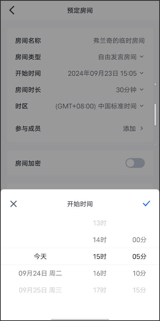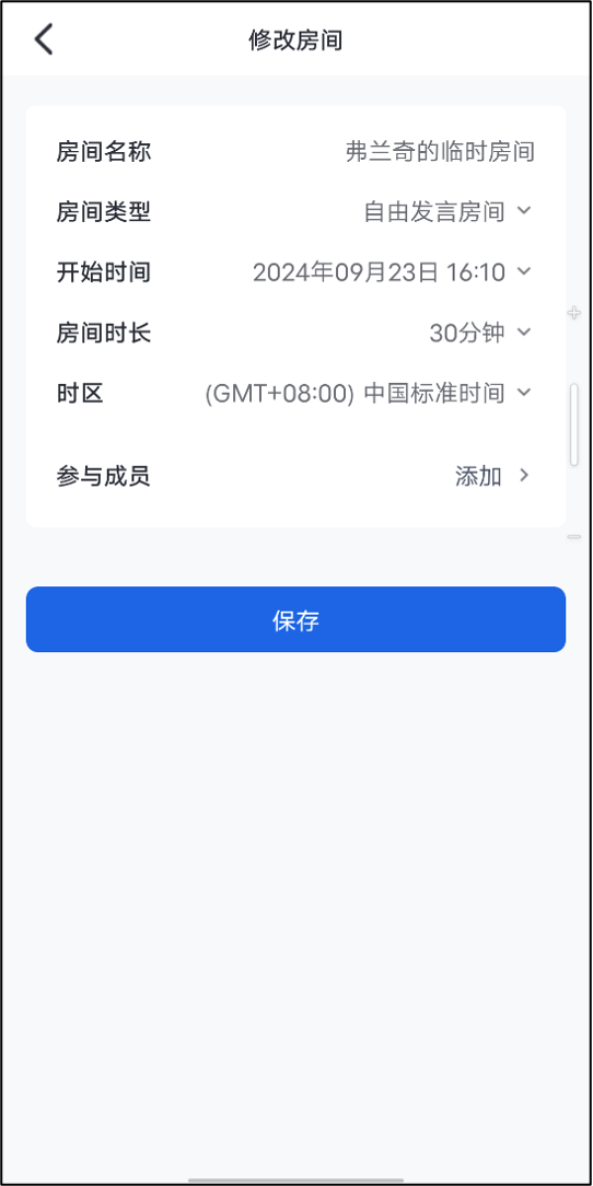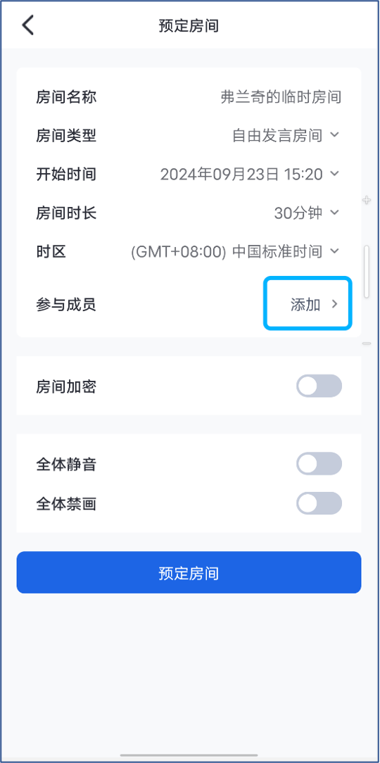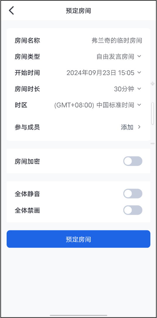 预定会议可设置的属性:其中可设置内容包含:房间名称、房间类型、开始时间、房间时长、时区、邀请成员(需导入成员列表)、房间加密、成员管理(全体静音、全体禁画)等。