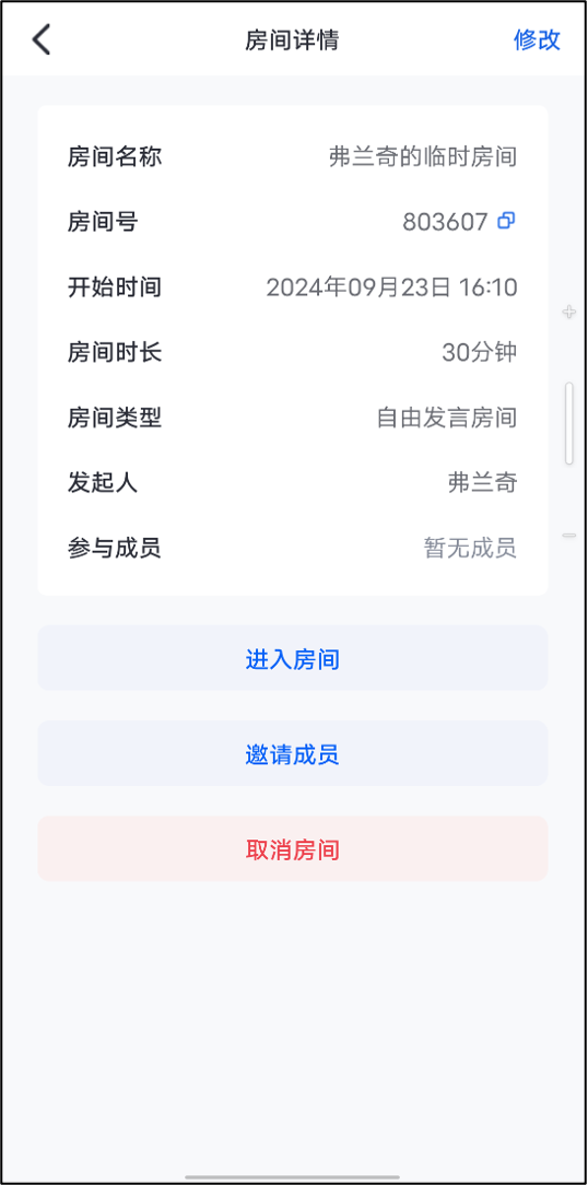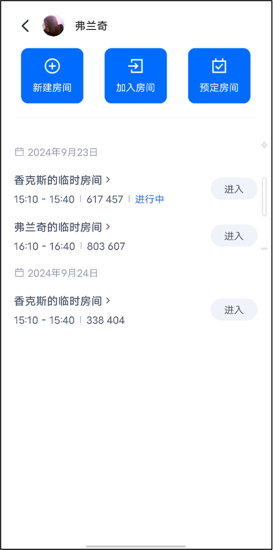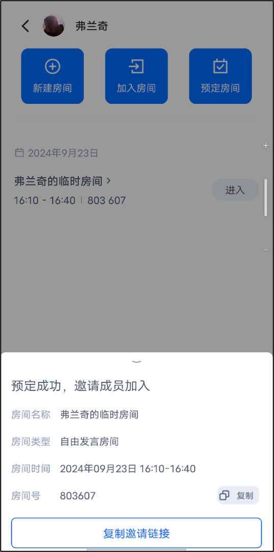 预定的房间到达结束时间后,若房间没有被解散且房间内没有用户,该房间将从预定结束时间起保留6小时,在此期间您仍可以随时进入该房间。