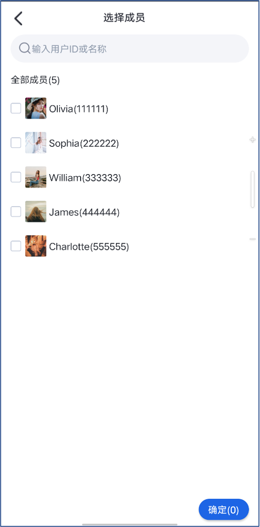 如何邀请成员:点击 "添加" 即可邀请成员。默认情况下用户列表需要您传入,为了方便您快速体验,我们提供了用户列表 Demo。具体请参见 如何邀请成员。