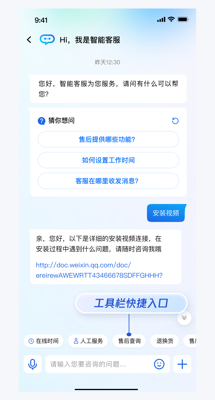 如果您想实现输入框上方增加快捷按钮,方便用户使用,例如增加“在线时间”,“售后查询”等,可使用