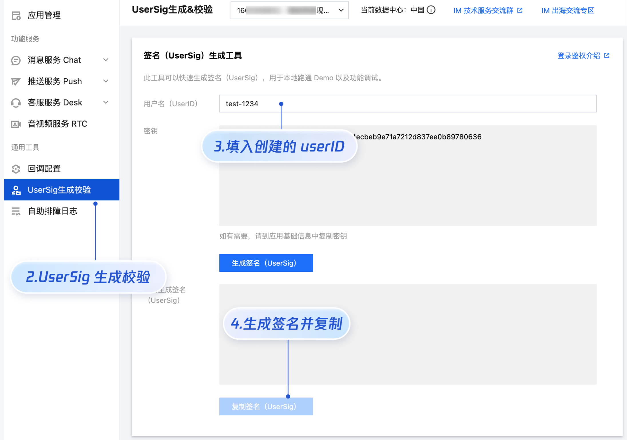 userSig 信息,可单击 即时通信 IM 控制台 > UserSig生成校验,填写创建的 userID,即可生成 userSig。