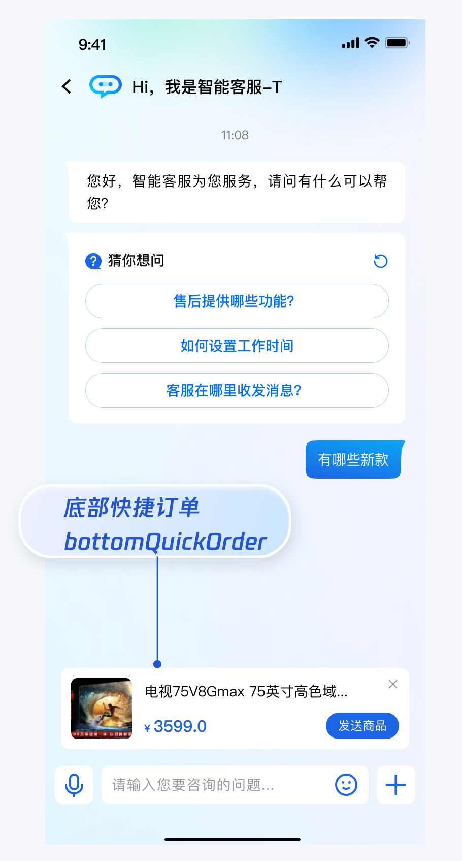 如果您想实现打开客服会话时在聊天区域底部展示快捷订单,效果如下所示: