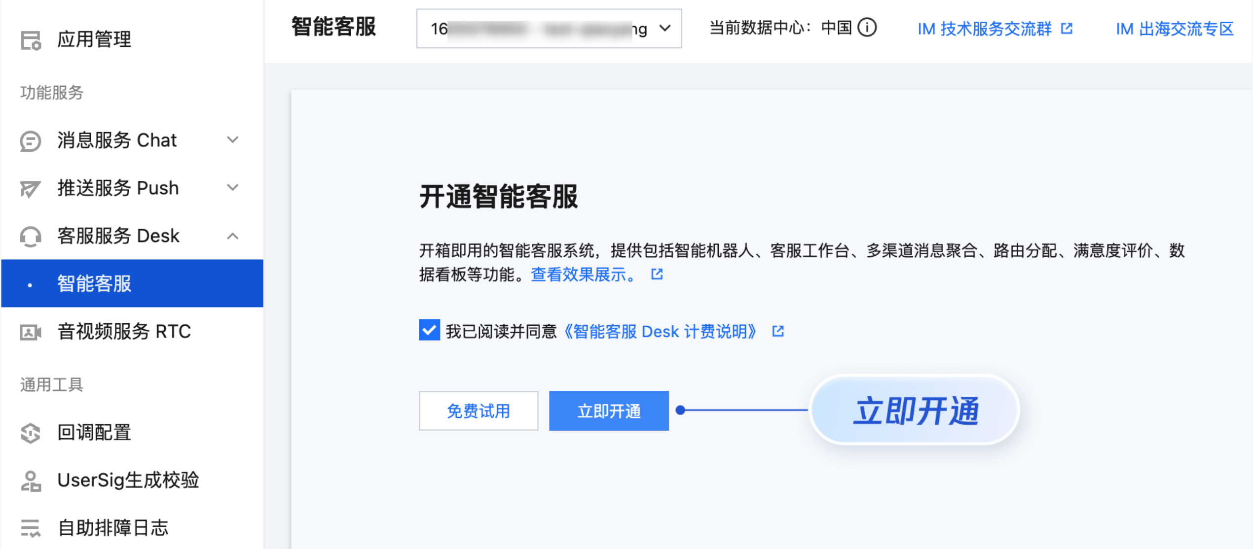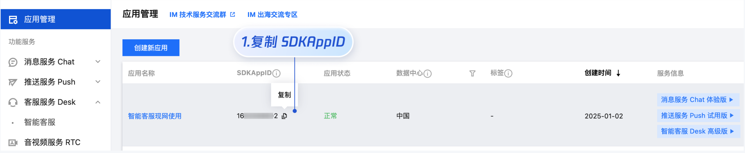 SDKAppID 信息,可在 即时通信 IM 控制台,单击应用管理 > 创建新应用,并选择客服服务 Desk > 智能客服, 开通智能客服 后获取。