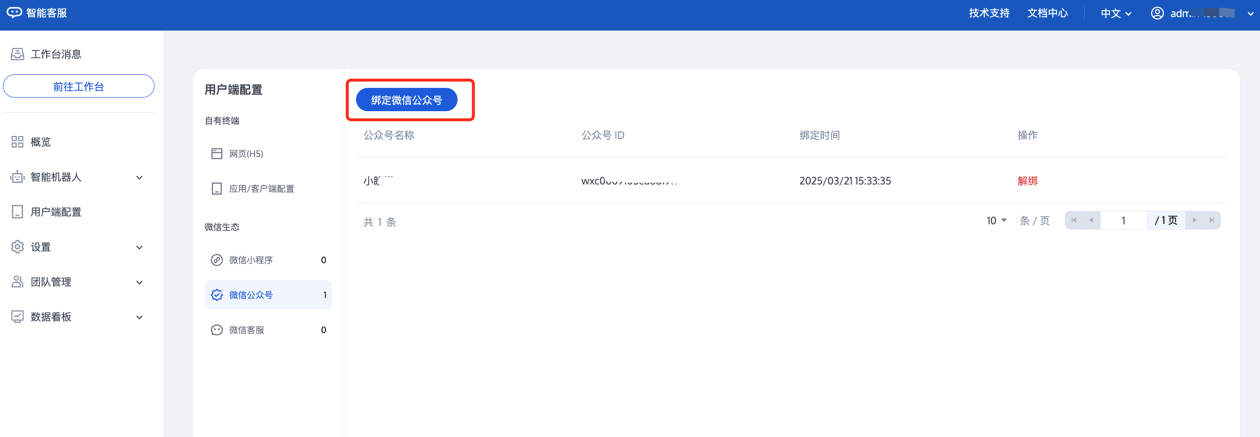 3. 授权成功后自动跳转用户端配置页面,显示已经绑定的公众号,表示该公众号已经绑定成功。