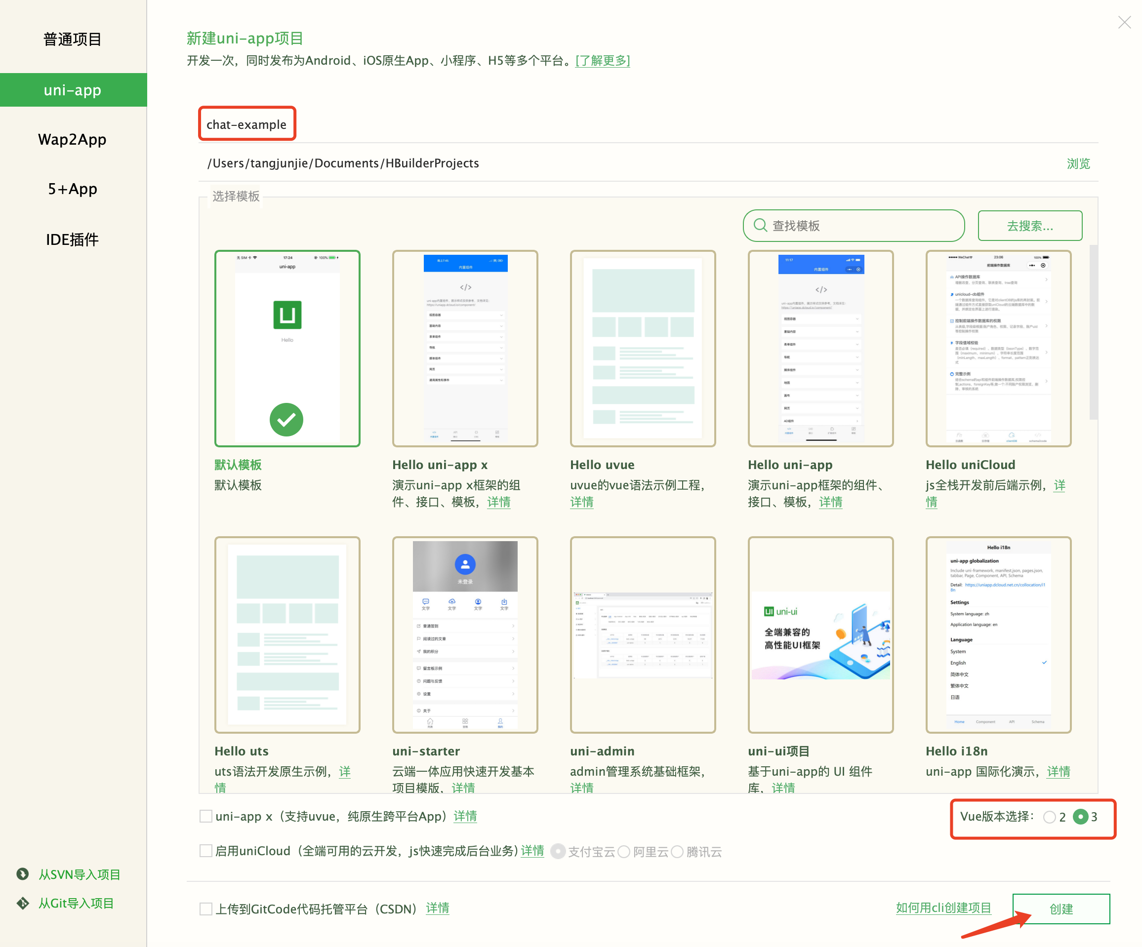 1. 打开 HBuilderX,在菜单栏中选择 “文件 > 创建 > 项目”,创建一个名为 chat-example 的 uni-app 项目。
