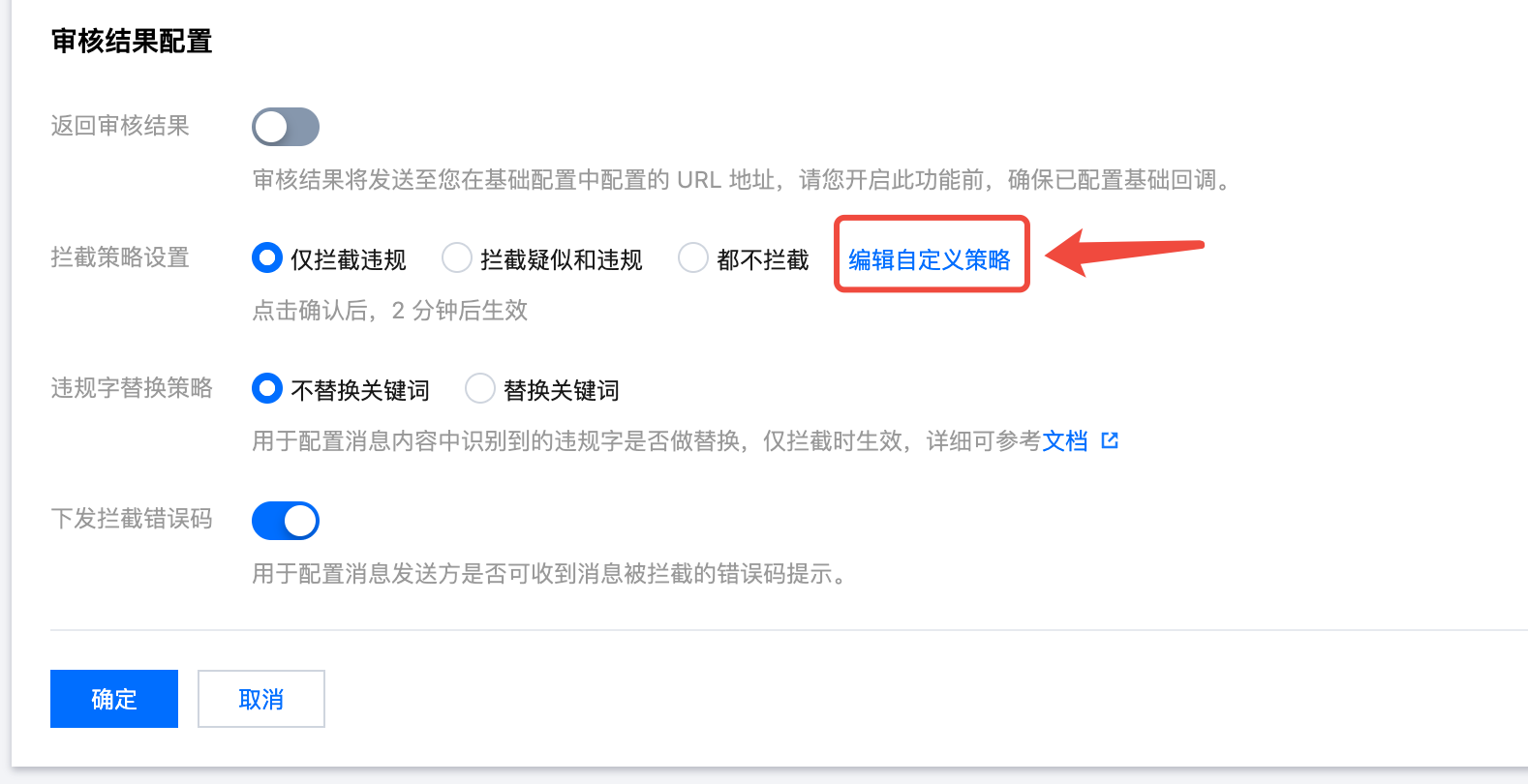 进入 即时通信 IM 控制台 ,左侧导航栏选择消息服务 Chat > 云端审核,单击审核配置,在单聊审核配置卡片中,在文本同步审核中单击编辑策略,打开广告 > 广告引流拦截策略。详情可参考文档 通用场景及策略配置。