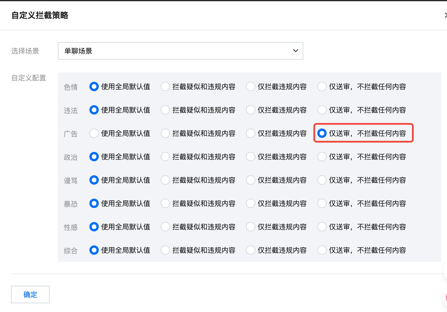 2. 自定义拦截策略中,场景选择单聊场景,对于广告选择仅送审,不拦截任何内容。
