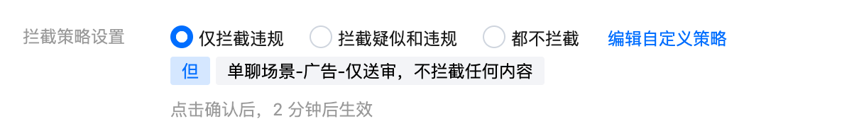 3. 配置后,拦截策略对于其他场景的违规内容都会进行拦截,但对于单聊场景中的广告内容,则仅送审,识别后回调到业务后台,并不会在聊天的过程中进行拦截。