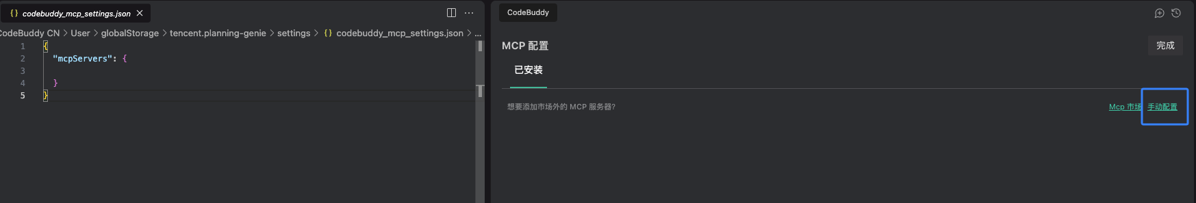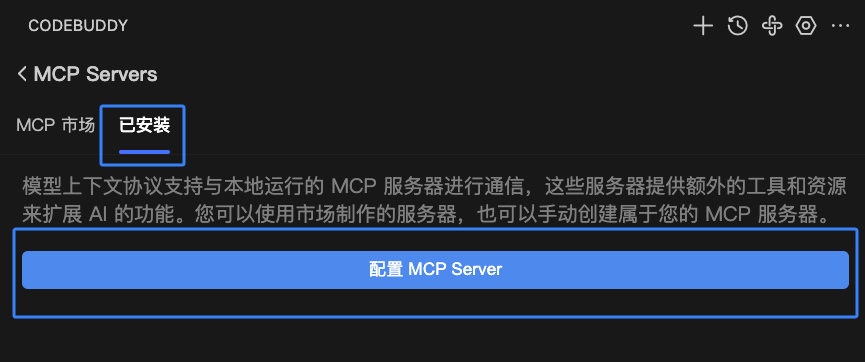 2. 创建安装成功后,在侧边栏找到 CODEBUDDY 入口,单击 MCP 市场图标 > 已安装 > 配置 MCP Server。