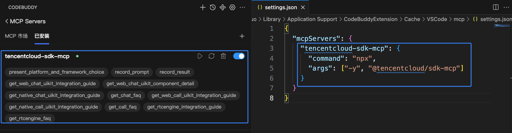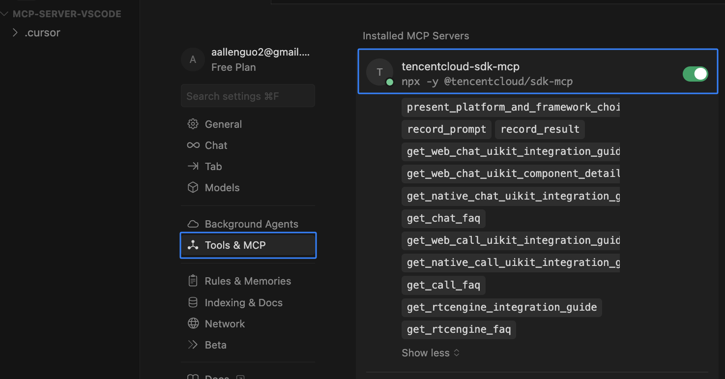 mcpServers 信息,配置信息如下:{"mcpServers": {"tencentcloud-sdk-mcp": {"command": "npx","args": ["-y", "@tencentcloud/sdk-mcp"]}}}