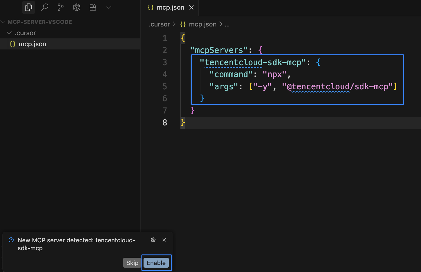 .cursor/mcp.json 文件,并将 mcpServers 的配置信息更新到 mcp.json 中。3. 当保存上述文件时,会弹出下图提示,选择 Enable 开启 MCP Server。