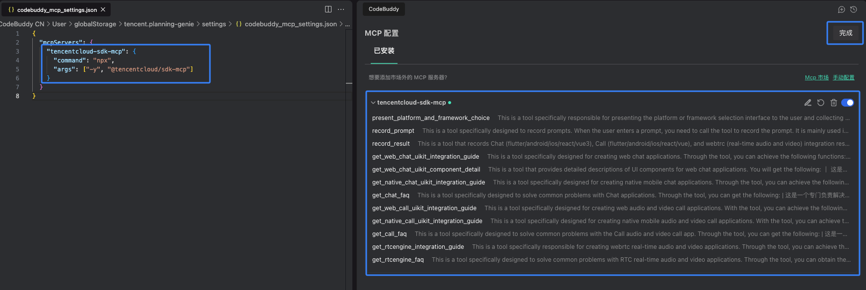 mcpServers 的配置信息更新到配置文件中。4. 配置保存时会自动开启 MCP Server, tools 加载成功后单击完成。