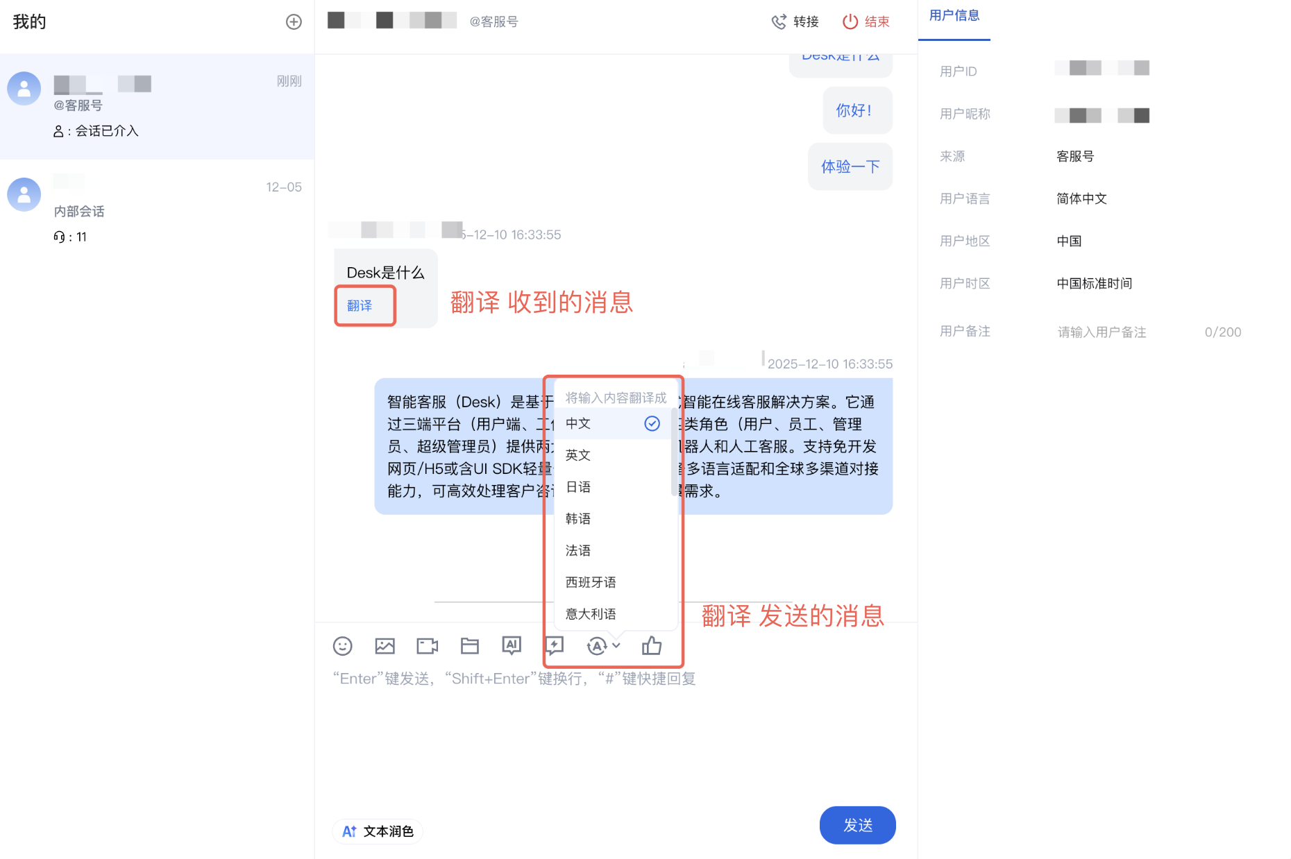 工作台的对话框中,直接呈现用户发送的内容(例如用户发送的是英文,工作台展示的就是英文;用户发送的是印尼语,工作台展示的就是印尼语。)