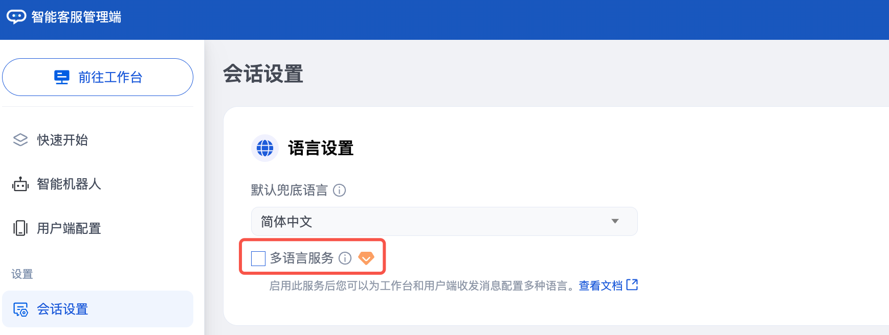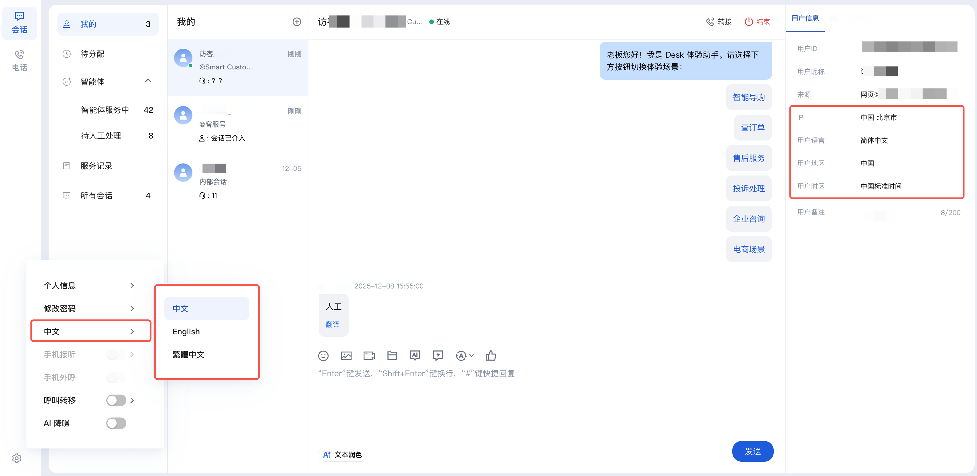 在 管理端,单击前往工作台,即可免密登录 工作台,并在工作台中以 员工 角色查看机器人正在接待的会话、处理“转人工”的用户对话,在对话右侧的用户信息栏会展示用户的 IP、语言、地区以及时区。同时,工作台页面左下角的设置中,也支持切换工作台界面语言。