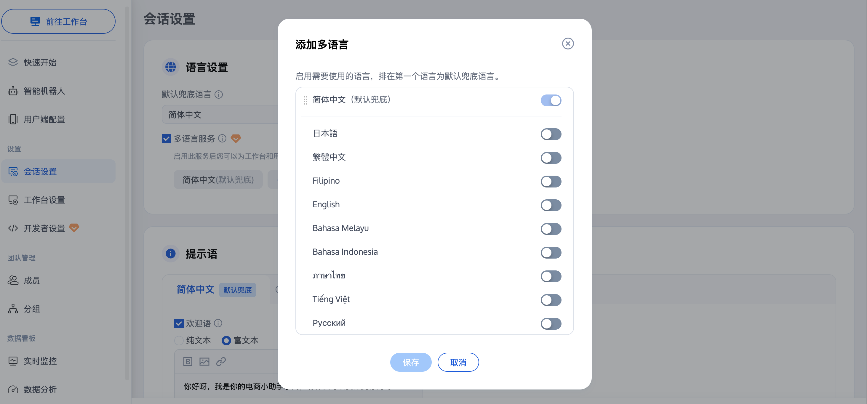 勾选多语言服务后,点击添加按钮,在添加语言弹窗中打开所需语言的开关(是接下来所有配置项的前提条件),并通过点击并拖拽已开启语言,对所选语言进行排序。其他关联配置项(例如提示语、分配策略、机器人知识库等配置)中,语言的展示顺序与此排序相关。