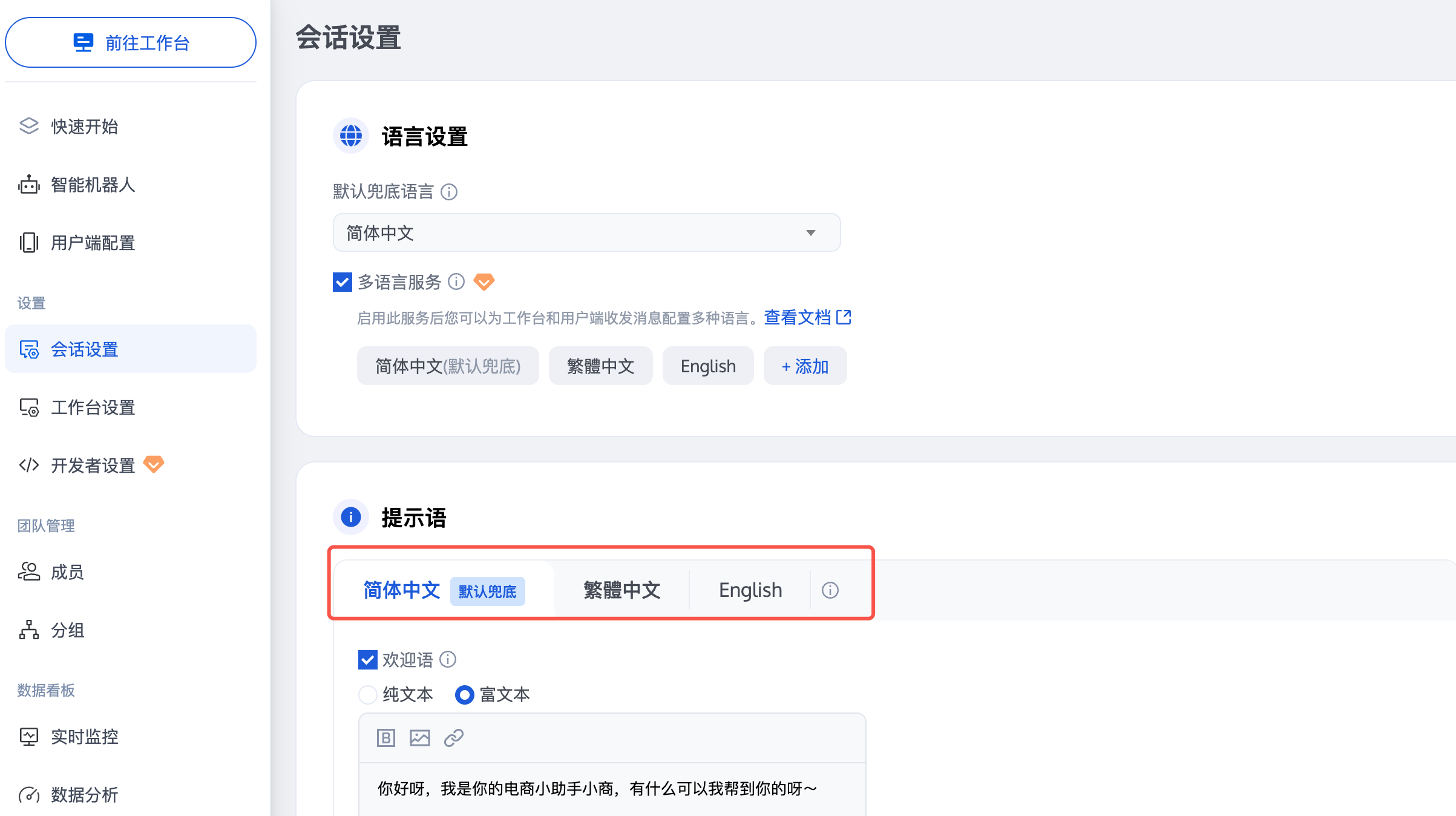 当用户咨询时,用户端可自动跟随系统语言或使用您指定的语言,识别到用户语言后,将生效对应语言在管理端已配置的话术及能力,包含对应语言下已配置的提示语、分配策略、机器人知识库(暂时不支持跨语种翻译,请分别上传所需语言对应的知识库)、满意度评价等。当识别到的用户语言,不在已配置的语言列表中时,会按照默认兜底语言生效对应话术和配置。