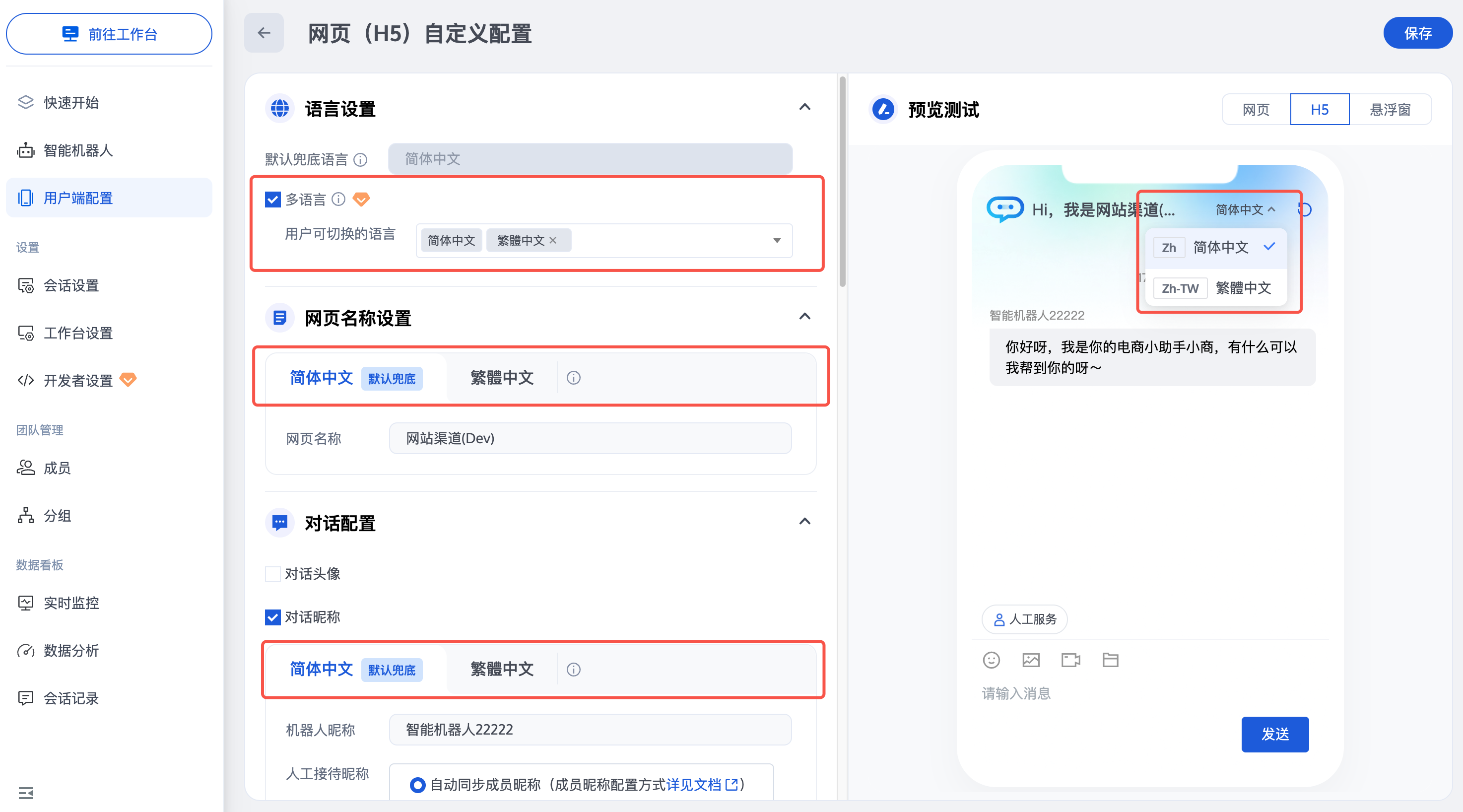 进入 管理端 > 用户端配置 > 网页/H5(免开发),点击自定义配置操作。在网页/H5自定义配置页面中,可以选择在此用户端生效的语言(仅可选择已在会话设置中添加的语言,如需增加语言,请先前往会话设置中添加)。