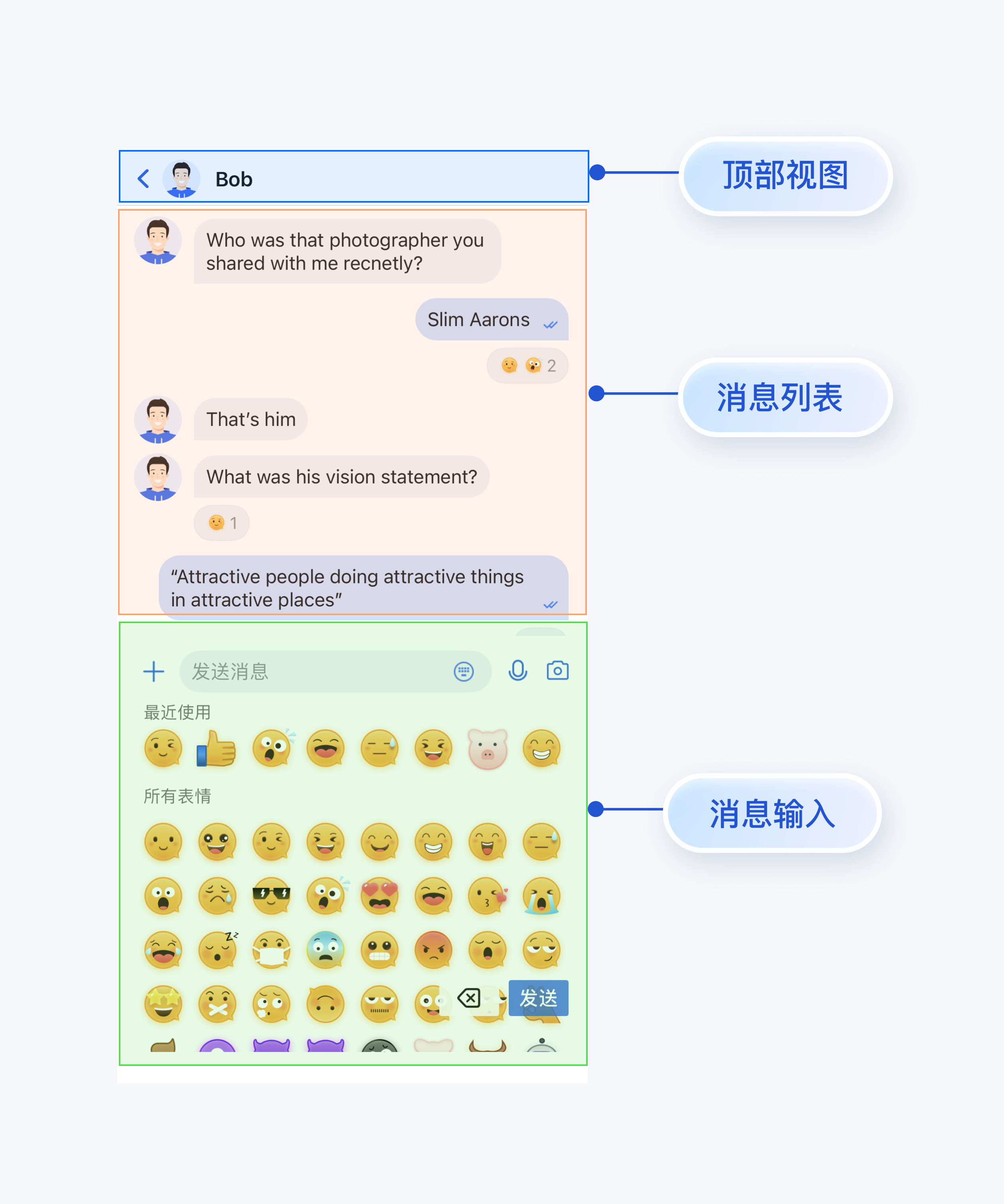 您可以将 MessageList 和 MessageInput 直接集成到现有的 App 页面中,也可以新构建一个完整的聊天页,组装后的一种 UI 效果如下图所示: