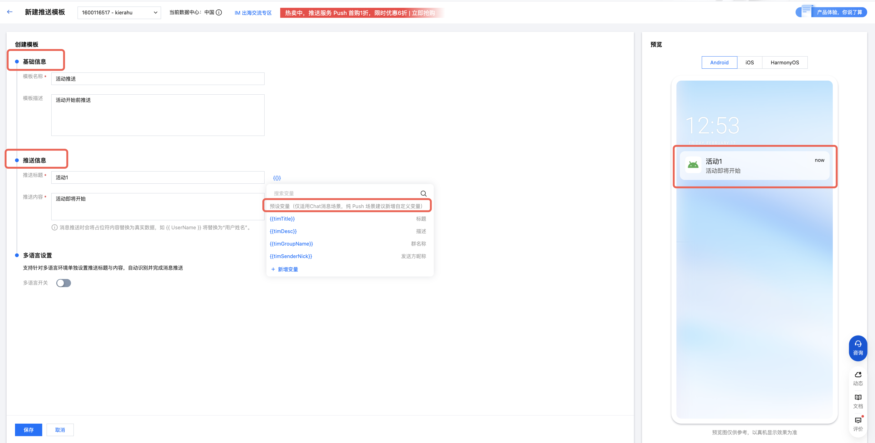 3. 填写推送信息:包括推送标题和推送内容。可选择添加预设变量(仅适用于 Chat 消息场景),纯 Push 场景可以点击新增自定义变量,页面左侧可查看推送预览。